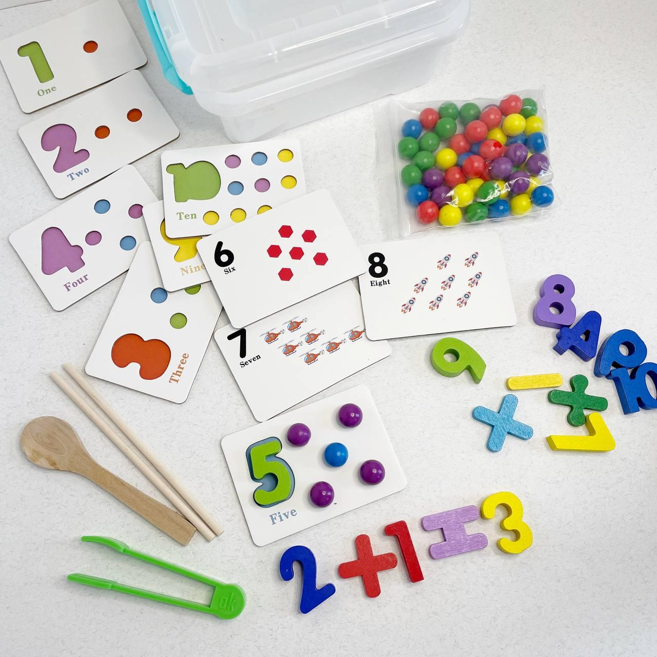 Дерев'яний набір для сортування включає намистини та картки з цифрами, що сприяють розвитку рахунку та творчого мислення у дітей. Якісні матеріали та яскраві кольори роблять гру захопливою та пізнавальною! Математичний сортер з кульками, пінцетом, картками з цифрами зберігається в пластиковому контейнері.